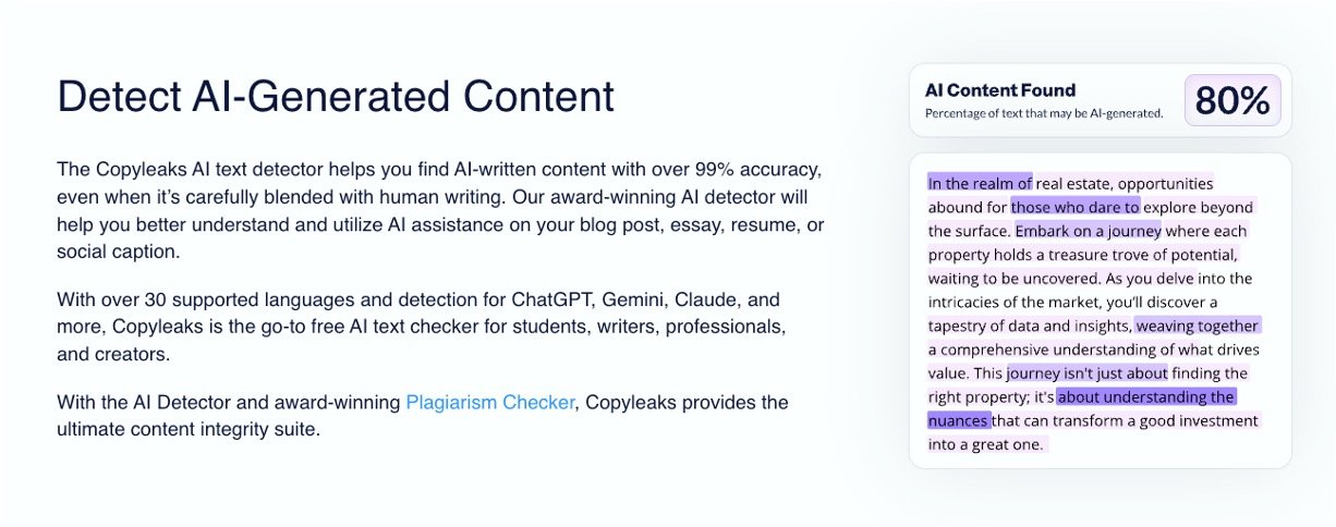 Copyleaks AI Content Detector is a tool designed to identify if text is written by a human or generated by AI. It uses advanced technology that looks for natural writing patterns in human text. When these patterns are missing or disrupted, it flags the text as AI-generated. This tool has tested over 99% accuracy, making it reliable for educators, businesses, and writers. It supports more than 30 languages and detects various AI models like ChatGPT, Gemini, and Claude. The detector can also analyze source code for AI creation and helps protect intellectual property and originality.