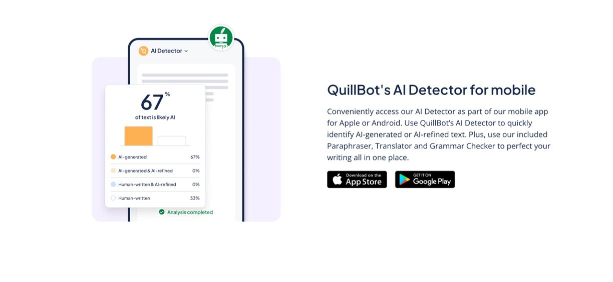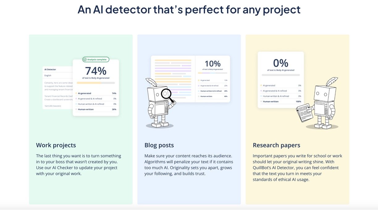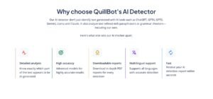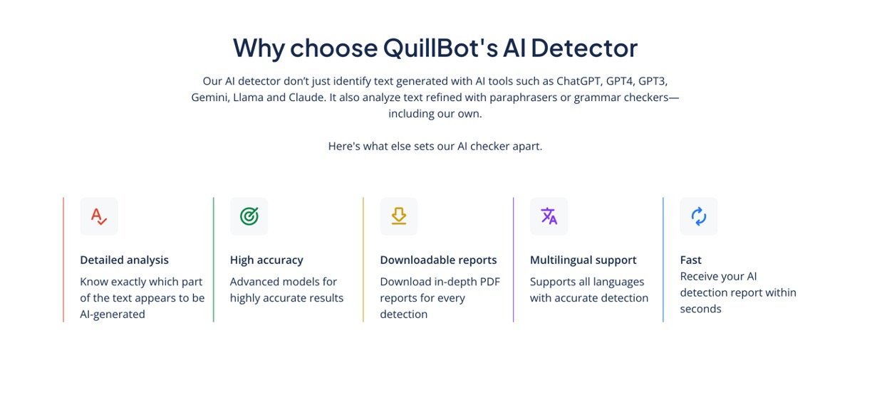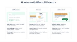 QuillBot AI Content Detector analyzes text to estimate the likelihood that it was written by AI or a human. It does not flag individual words but looks at writing patterns like repetition, generic language, and lack of tone variation. The tool works by measuring perplexity (predictability) and burstiness (sentence length variation). It supports multiple languages and provides detailed feedback on which parts of the text appear AI-generated, AI-refined, or human-written. QuillBot’s AI detector helps educators, writers, and content creators verify originality and understand AI’s role in the writing process.
